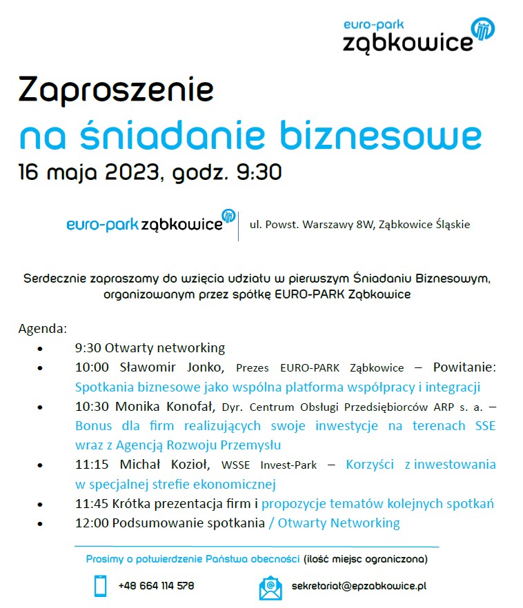 Serdecznie zapraszamy Przedsiębiorców z Kotliny Kłodzkiej na Śniadanie Biznesowe organizowane przez EURO-PARK Ząbkowice.