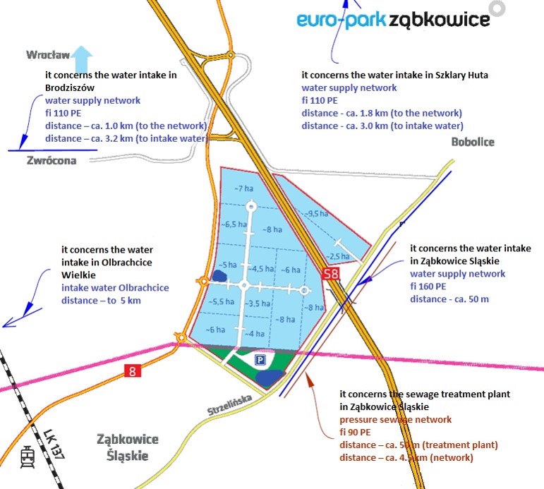 EURO-PARK Ząbkowice w chwili obecnej może być podłączony do sieci wodociągowej, kanalizacji sanitarnej oraz do sieci odprowadzającej ścieki socjalno-bytowe wzdłuż jego południowo-wschodniej części - droga powiatowa Ząbkowice Śląskie - Bobolice. Spółką wodociągową działającą w Ząbkowicach Śląskich jest PWiK Delfin Sp. z o.o. Spółka wodociągowa planuje modernizację istniejącej oczyszczalni ścieków wraz z jej rozbudową w celu przyjęcia większego strumienia ścieków. Obecna przepustowość oczyszczalni wynosi ok. 2500 m3/dobę i znajduje się ok. 5 km od działki. W zakresie zaopatrzenia w wodę, rozpatruje się dwa ujęcia wody: w Kamieńcu Ząbkowickim oraz w Olbrachcicach Wielkich.