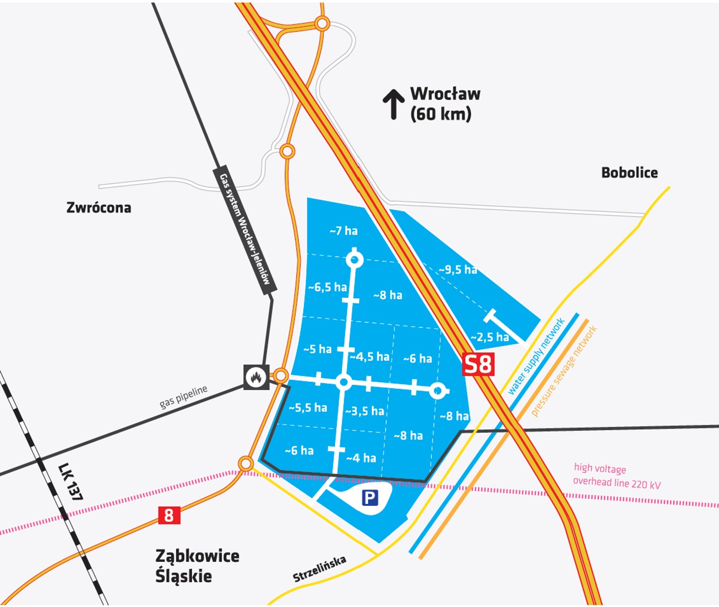 Droga ekspresowa S8, która połączy teren z autostradą A4, przebiegać będzie bezpośrednio przy działce inwestycyjnej. Zakończenie budowy Drogi S8 zaplanowano na 2026 rok. Dodatkowo planowana jest rozbudowa drogi DK8 o drugi pas ruchu i rozwój elektryfikacji linii kolejowej, biegnącej na odcinku Legnica – Katowice, co znacząco zwiększy atrakcyjność tego terenu pod inwestycje.